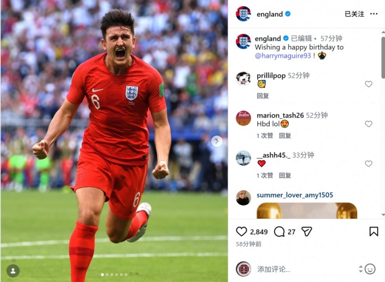 英格兰队官方社媒晒出马奎尔的照片,配文:“祝马奎尔生日快乐!”